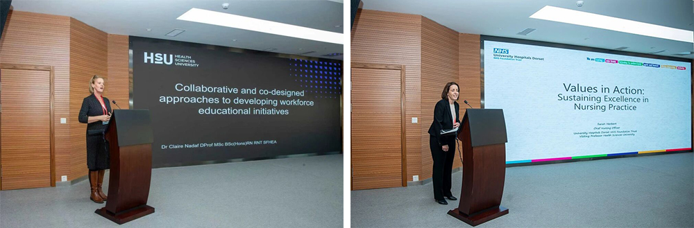 在专题学术报告环节,两位英国护理专家结合丰富经验与研究成果分享前沿理念。Claire Nadaf教授以“人力教育计划的开发路径”为主题,系统介绍通过协作与共同设计方法科学制定教育计划的实践,阐述其在提升人力效能、构筑人才发展可持续基础中的关键作用。Sarah Herbert教授围绕“行动中的价值观:持续卓越的护理实践”发表报告,从护理专业核心价值观出发,分享复杂医疗环境下激发团队潜能、引领护理质量持续改进的策略,为患者提供高质量、有温度护理服务的实践路径。