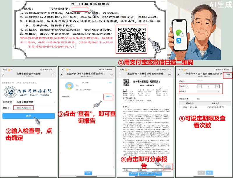 1、扫码即查:所有PET/CT、PET/MRI、SPECT检查前都会为患者提供报告查询的二维码及检查号,影像报告发出后,患者使用微信或支付宝扫描二维码,输入检查号后,即可实时查看完整的影像报告和全部图像,随时随地,即扫即得!