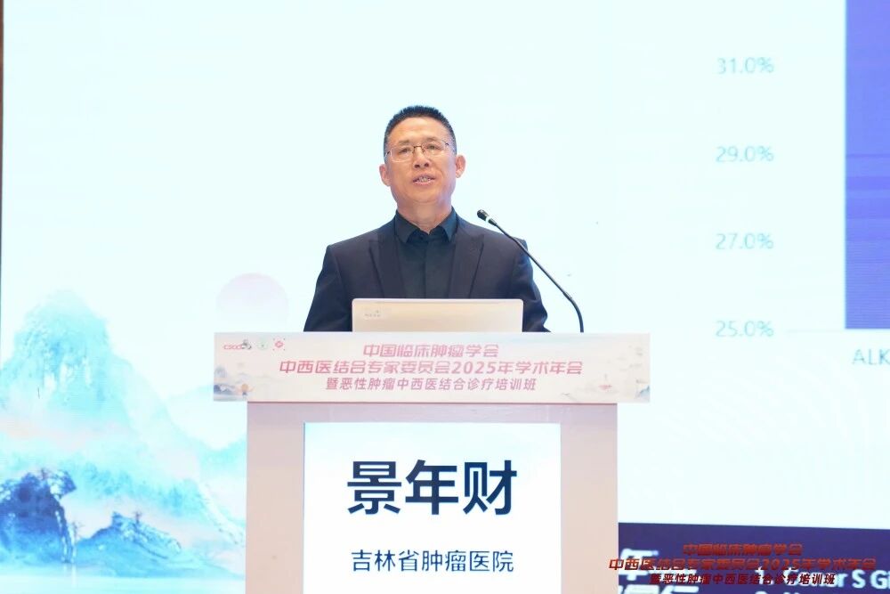 学术交流环节,吉林省肿瘤医院中西医结合科副主任景年财以《从预防脑转出发,重构ALK阳性NSCLC“治愈”之路》为题,分享了相关疾病从预防到转归的创新诊疗策略。