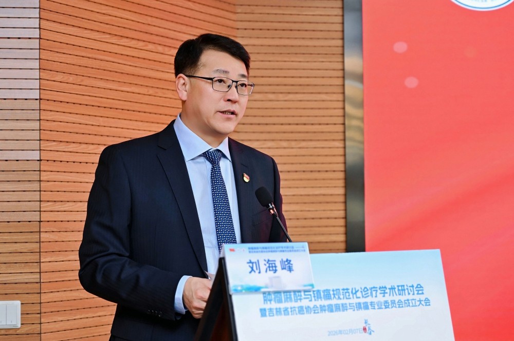 成立仪式上,刘海峰书记发表致辞。他指出,肿瘤麻醉与镇痛专业委员会的成立,是我省肿瘤诊疗事业向专业化、精细化迈进的关键一步,更是践行“以患者为中心”理念、落实“十五五”规划纲要中“深化医药卫生体制改革、强化重大疾病防治”部署要求的重要实践,与“健康中国2030”战略深度契合,是健全肿瘤全周期健康管理体系、推动诊疗规范化同质化的关键举措。肿瘤治疗是一项系统工程,麻醉与镇痛贯穿于手术切除、有创操作、放化疗乃至终末期舒缓疗护的全过程,其核心价值不仅在于保障手术安全、创造无痛条件,更在于通过精准管理维护患者生理功能稳定,为抗肿瘤综合治疗保驾护航,直接关系到恶性肿瘤早诊早治成效与患者长期生存质量的提升。近年来,我省相关团队在优化围术期管理、推行规范化癌痛治疗、探索多模式镇痛等方面的实践积累,为专委会成立提供了坚实支撑。期望专委会主动对接国家及地方卫生健康发展战略,将工作融入健康吉林建设大局,整合多学科资源推动临床路径标准化,强化人才培养与科研创新,以学科高质量发展助力分级诊疗体系完善与区域医疗中心建设,为提升全省肿瘤防治整体水平、筑牢群众健康防线贡献核心力量。
