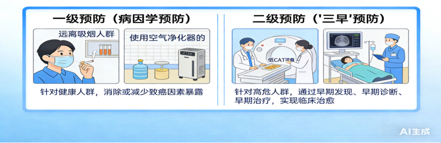 肺癌的发生是一个长达十几年甚至几十年的缓慢过程:致癌因素长期刺激→支气管和肺泡受损→细胞异常增生→癌变,这为我们留下了充足的预防与干预窗口。做好肺癌防控,核心是做好两级预防:一级预防针对健康人群,远离致癌因素;二级预防针对高危人群,做到早发现、早诊断、早治疗。