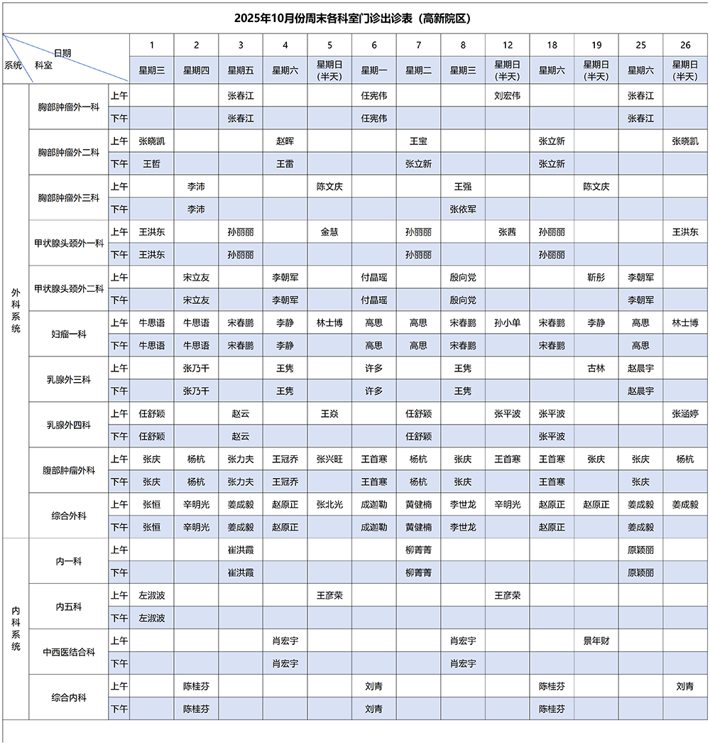 当前位置:首页 > 就医指南 > 专家出诊时间 2025年10月份周末各科室门诊出诊表(仅供参考 以实际出诊情况为准) 来源: 时间:2025-09-25 浏览: 次 2025年10月份周末各科室门诊出诊表(仅供参考 以实际出诊情况为准)来源:吉林省肿瘤医院门诊办公室初审人:陈靖石复审人:贾春祎终审人:梁长林